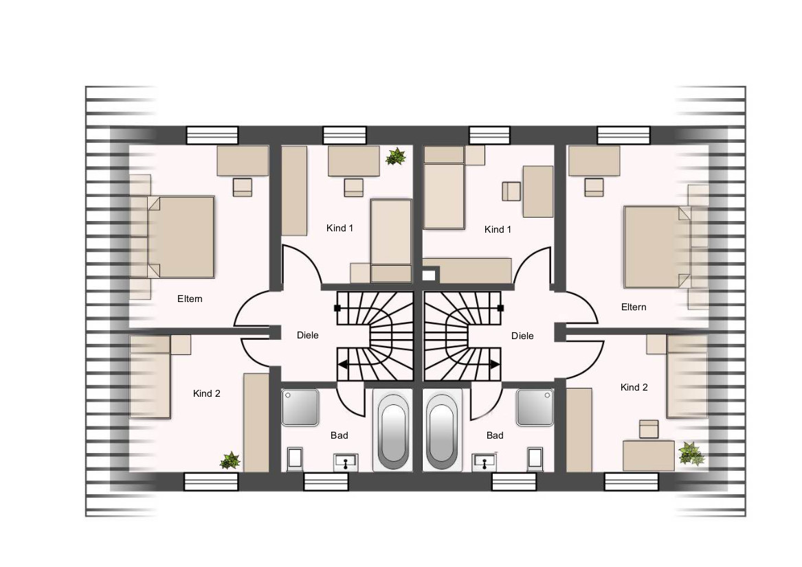 Dachgeschoss: Im Dachgeschoss warten drei weitere Räume auf Sie, die wir im Grundriss als Elternschlafzimmer, Kinderzimmer 1 und Kinderzimmer 2 vorgesehen haben. Doch wie immer gilt: Ihrer Fantasie sind keine Grenzen gesetzt. Hier oben könnten natürlich auch ein Homeoffice entstehen, ein Gästezimmer oder ein Hobbyraum – oder was immer Sie sich wünschen. Das Tageslicht-Badezimmer des Dachgeschosses ist mit einer Badewanne, einer Dusche, einem Waschbecken und einem WC ausgestattet.