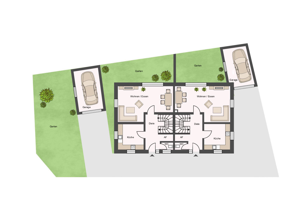 Im Folgenden beschreiben wir die rechte Doppelhaushälfte. Die linke Doppelhaushälfte ist identisch, jedoch spiegelverkehrt, aufgebaut.