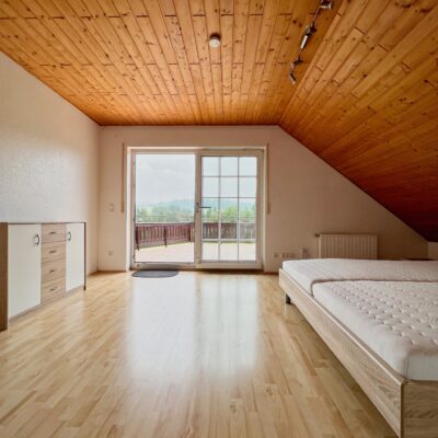 Über das aus Granit bestehende Treppenhaus gelangen Sie in das Obergeschoss. Hier erwarten Sie weitere ca. 90 m² Wohnfläche. Die drei Räume, die natürlich individuell gestaltet werden können, haben wir dieses Mal in unserem Grundriss als Kinderzimmer vorgesehen. Von zwei Räumen ist der Zutritt auf die knapp 50 m² große, nach Südwesten ausgerichtete, Terrasse möglich, die Ihnen eine atemberaubende Aussicht über die Landschaft und in den Garten bietet. Der dritte Raum ist mit den notwendigen Küchenanschlüssen ausgestattet, was ihm eine bemerkenswerte Flexibilität verleiht. Das moderne Duschbad wurde mit Liebe zum Detail gestaltet und passt zum Gesamtdesign der Wohnungsebene.