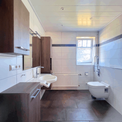 Das modernisierte Tageslichtbad wurde im Jahr 2019 saniert und präsentiert sich heute im zeitgemäßen Stil mit ebenerdiger Dusche.