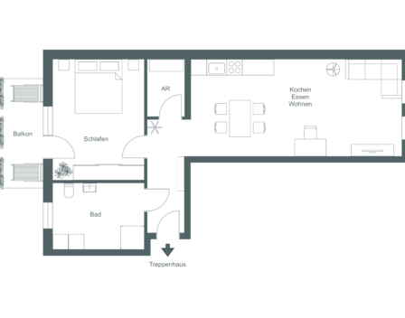 Im Erdgeschoss befindet sich ein geräumiger Wohn-/ Essbereich der bedingt durch die großen Fenster, die viel Tageslicht hereinlassen, hell und freundlich erscheint. Von hier aus gelangen Sie direkt in die Küche, die Mitte der 60er Jahre angebaut worden ist und die mit knapp 10 m² eine schöne Größe hat. Sie bietet zudem den Zutritt auf die durch eine Markise geschützte Terrasse. Das Büro im Erdgeschoss, das als inspirierender Arbeitsplatz oder auch als Rückzugsort genutzt werden kann, ist ebenfalls über den Wohn-/ Essbereich zu erreichen. Ein weiteres Zimmer, in unserem Grundriss als „Wohnen“ bezeichnet, kann sicherlich als weiteres Wohnzimmer genutzt werden aber natürlich auch als Gäste- oder Kinderzimmer.