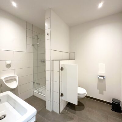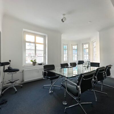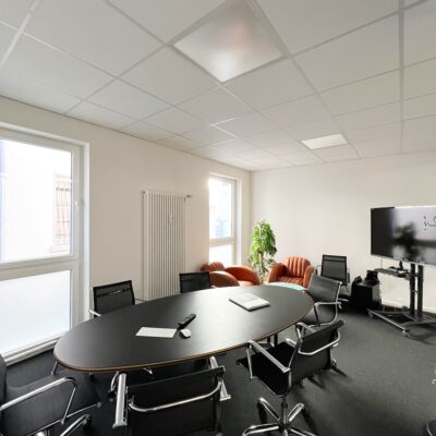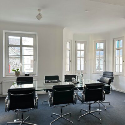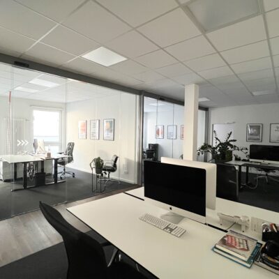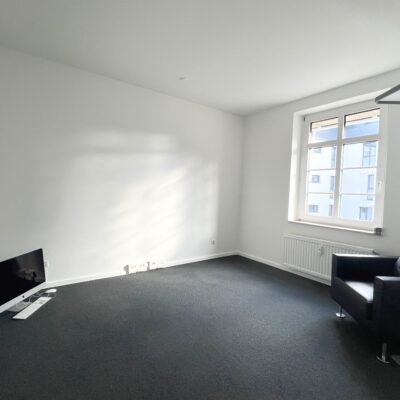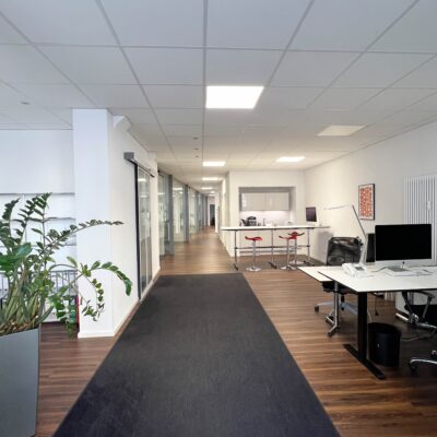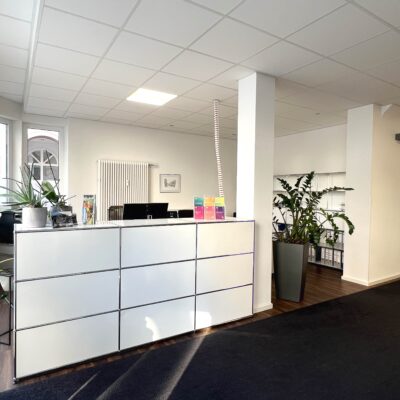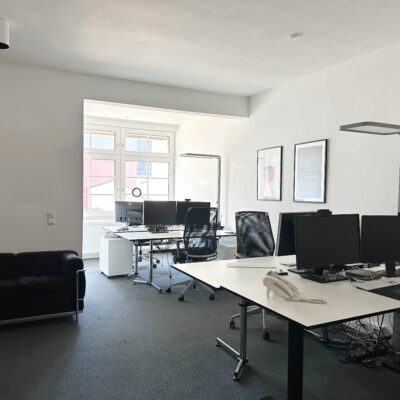 Im Jahr 1984 wurde das Gebäude rückwärtig erweitert. Durch diesen Anbau entstand im Erdgeschoss eine großzügige Gewerbefläche von rund 228 m². Die Fläche eignet sich ideal für Büro-, Dienstleistungs- oder Agenturnutzungen und ist aktuell solide vermietet. Die Flächen präsentieren sich modern, offen und hochwertig – mit großzügigen Arbeitsbereichen sowie ergänzenden, abgetrennten Büroräumen. Für dieses Mietverhältnis besteht auch in den kommenden Jahren Planungssicherheit, sodass hier stabile Mieteinnahmen gegeben sind.