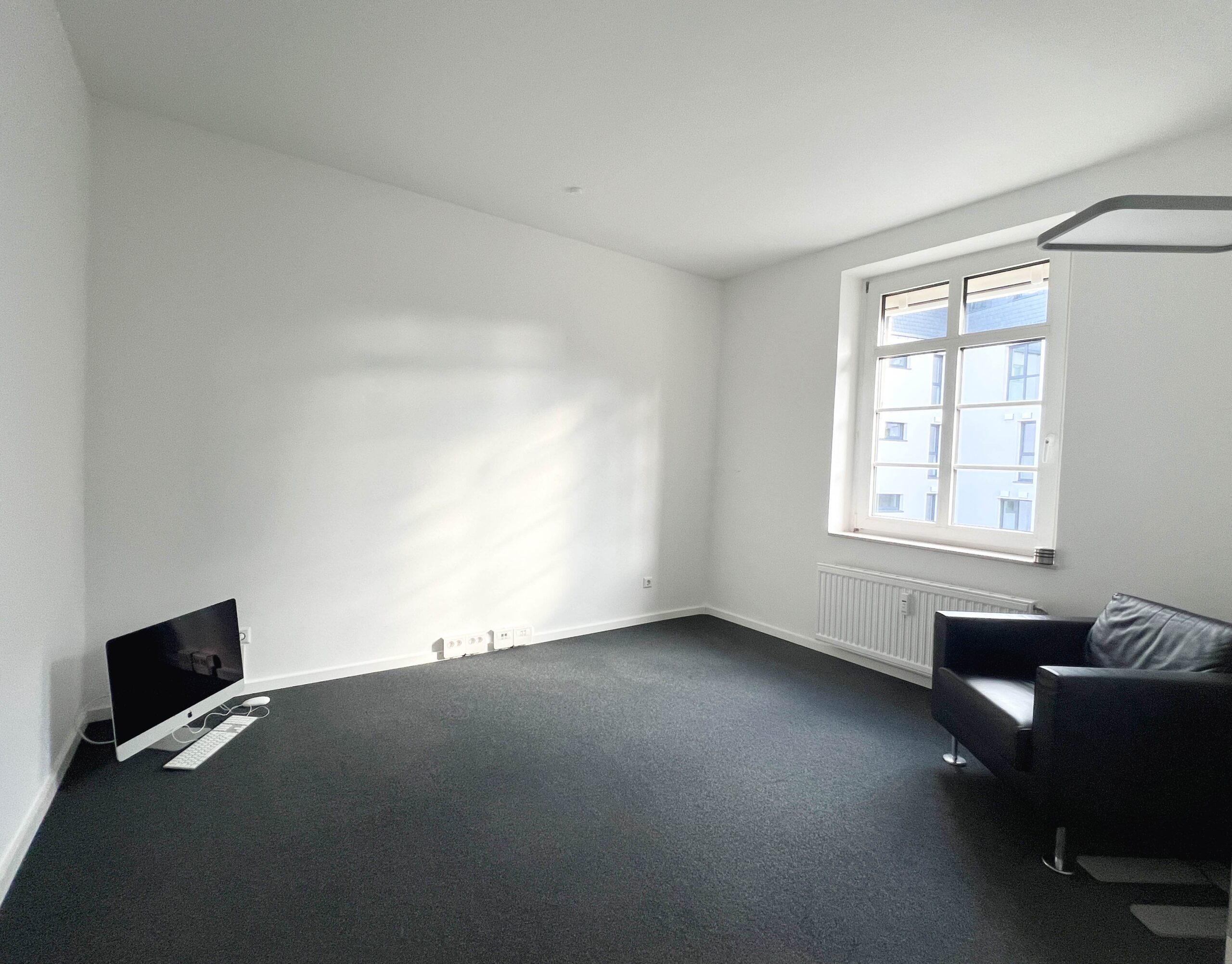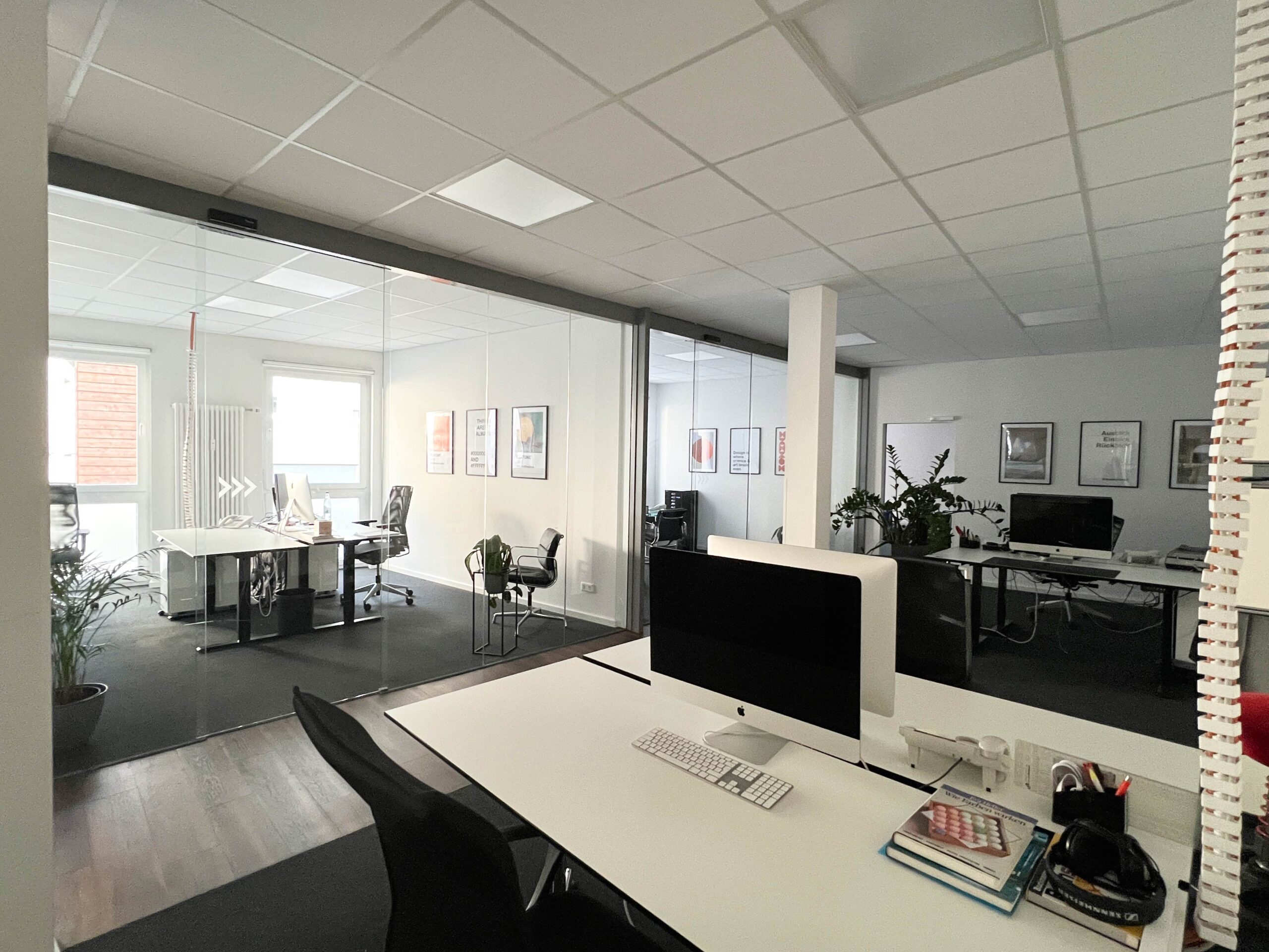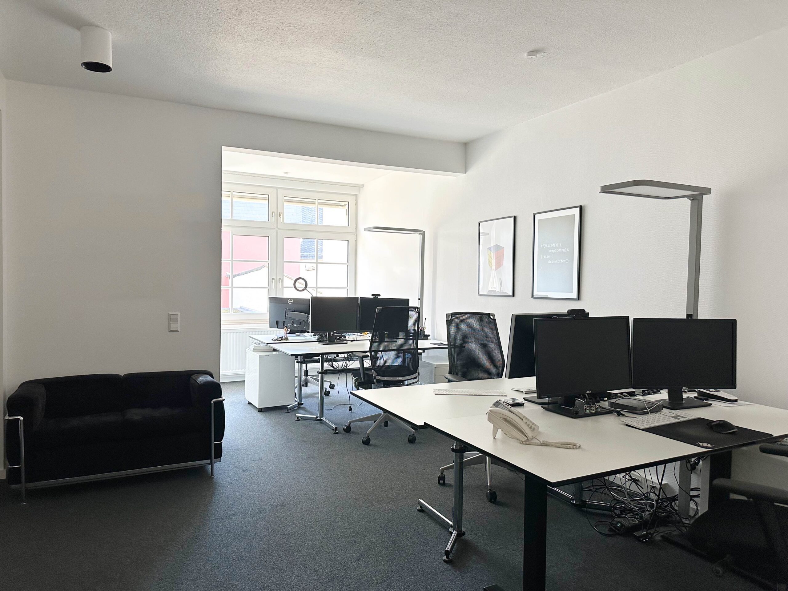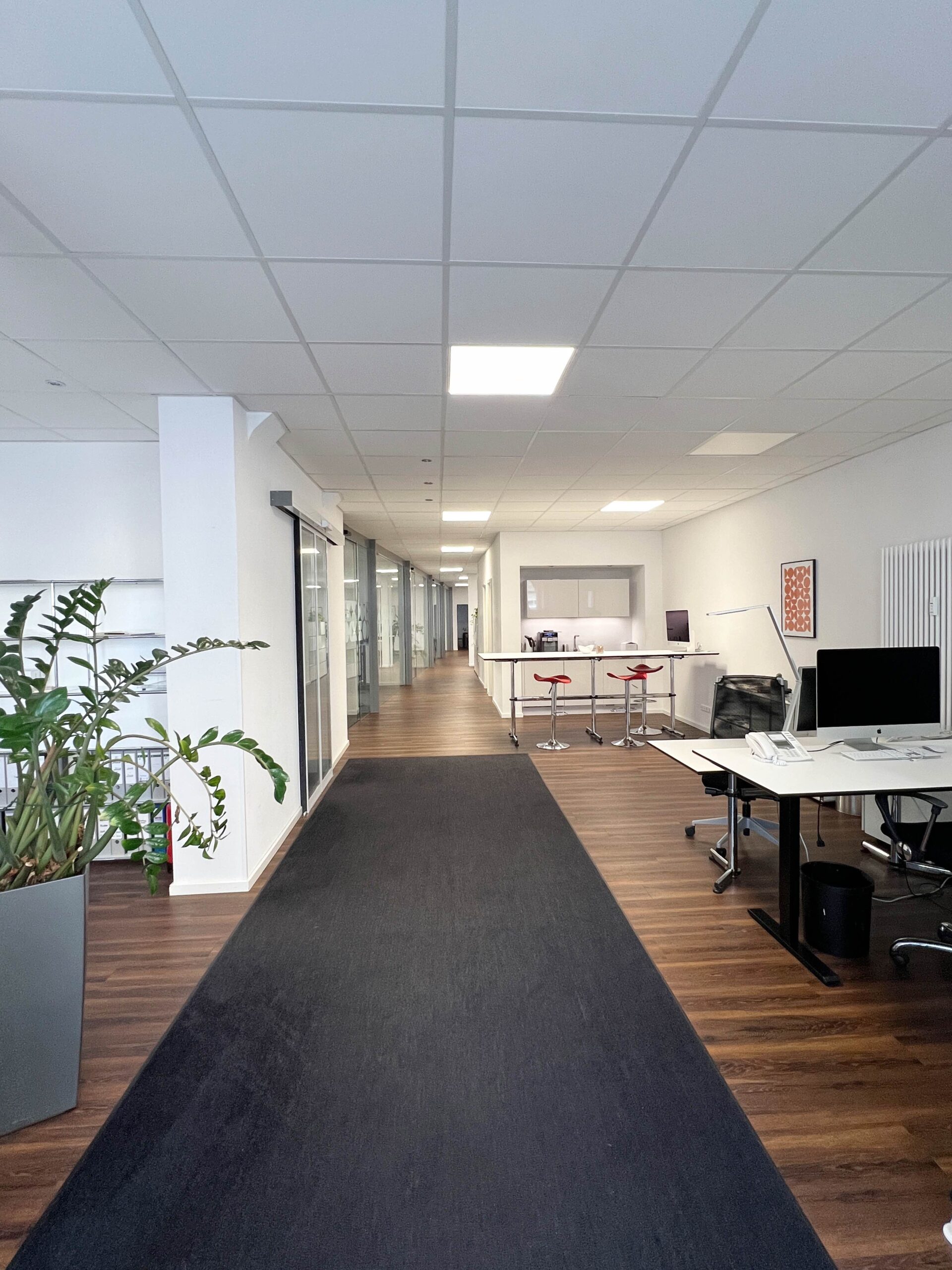 Im Jahr 1984 wurde das Gebäude rückwärtig erweitert. Durch diesen Anbau entstand im Erdgeschoss eine großzügige Gewerbefläche von rund 228 m². Die Fläche eignet sich ideal für Büro-, Dienstleistungs- oder Agenturnutzungen und ist aktuell solide vermietet. Die Flächen präsentieren sich modern, offen und hochwertig – mit großzügigen Arbeitsbereichen sowie ergänzenden, abgetrennten Büroräumen. Für dieses Mietverhältnis besteht auch in den kommenden Jahren Planungssicherheit, sodass hier stabile Mieteinnahmen gegeben sind.