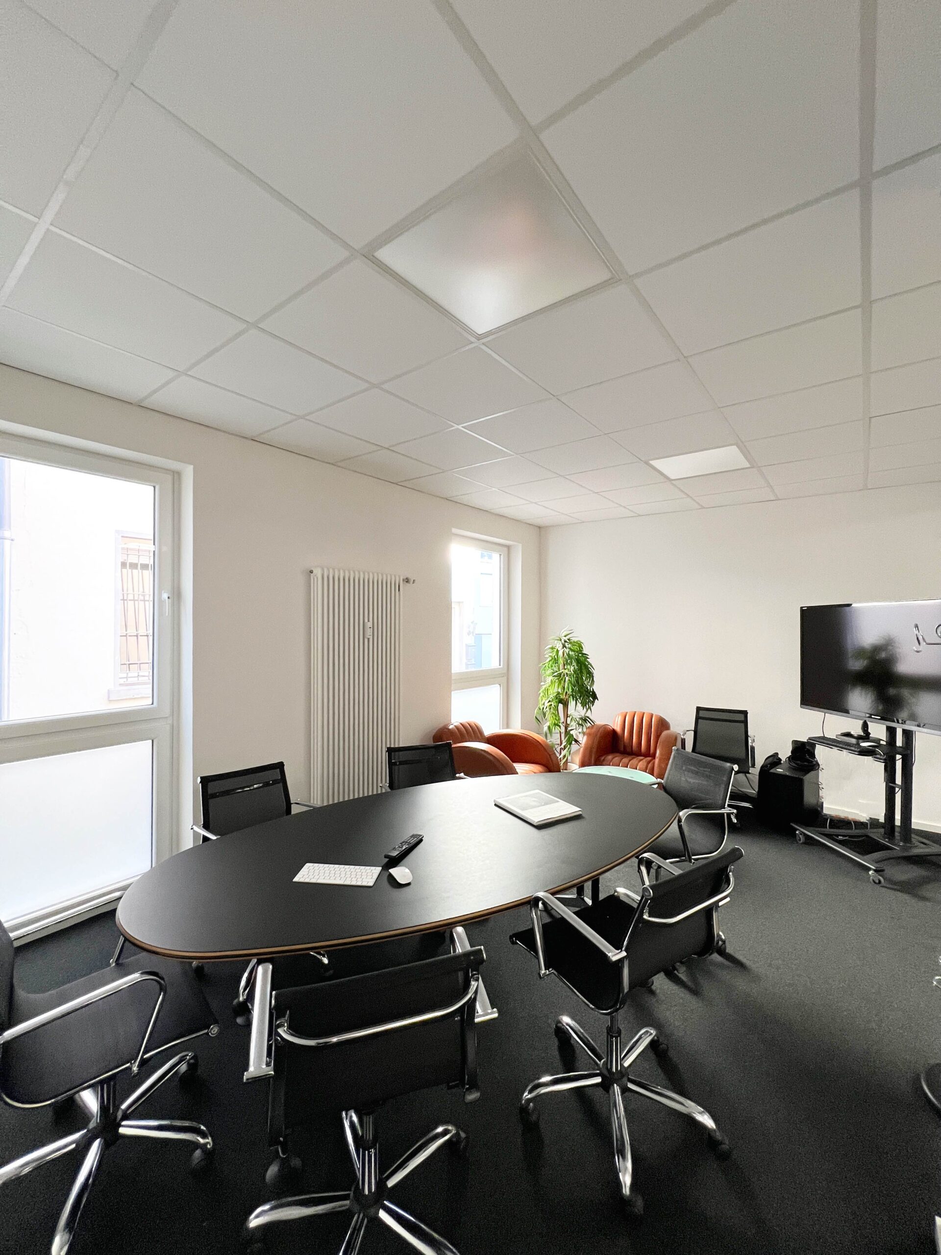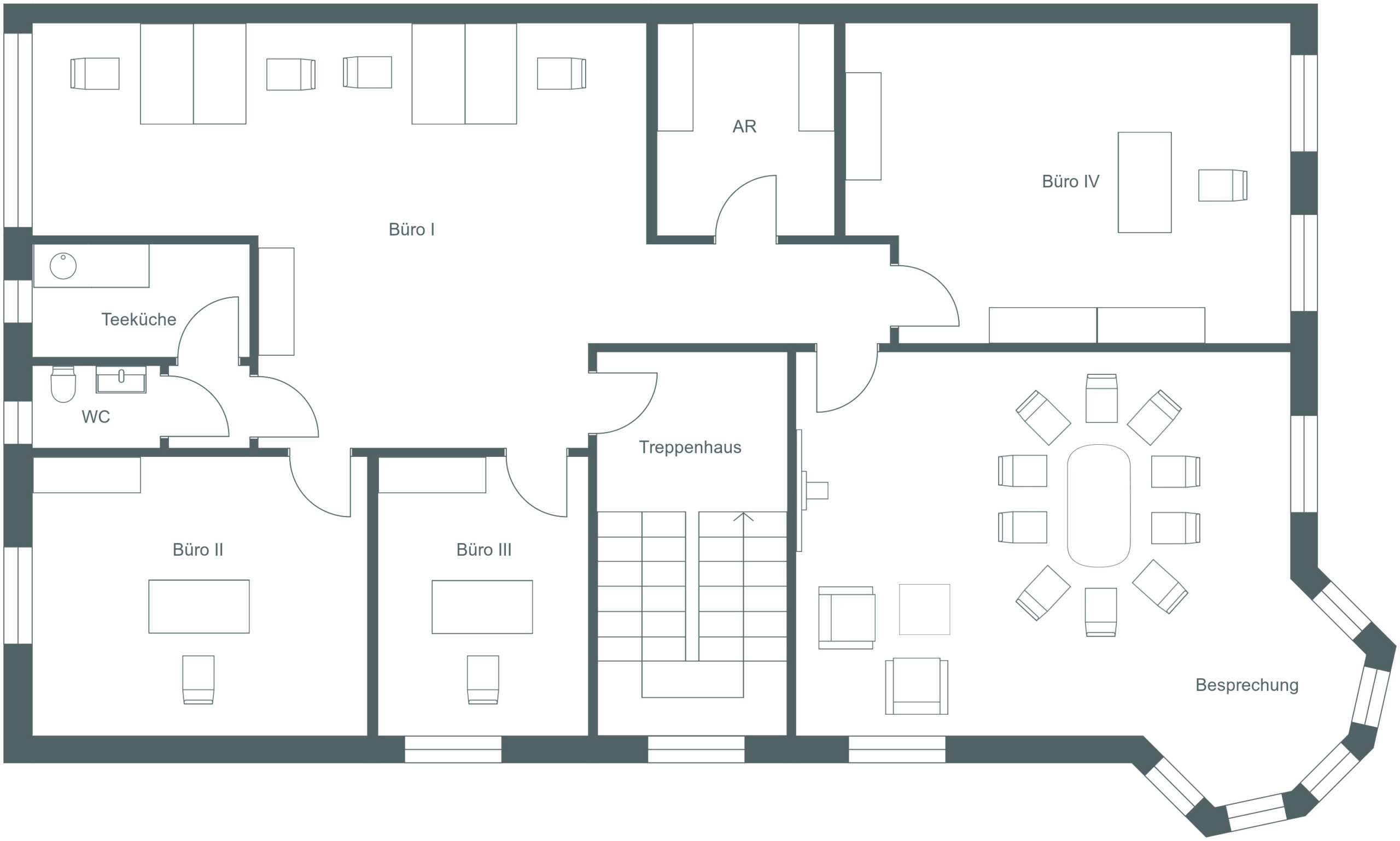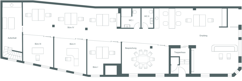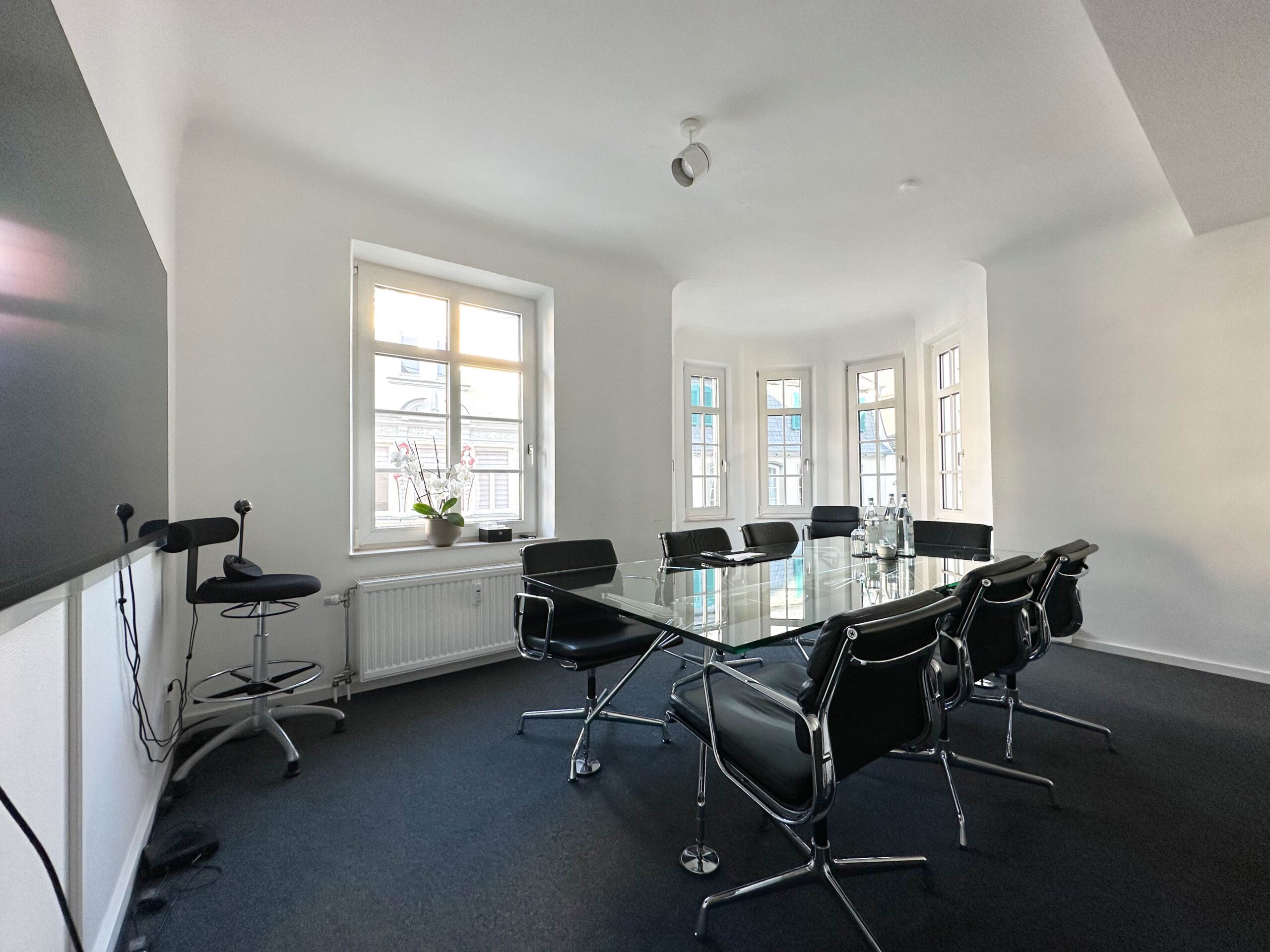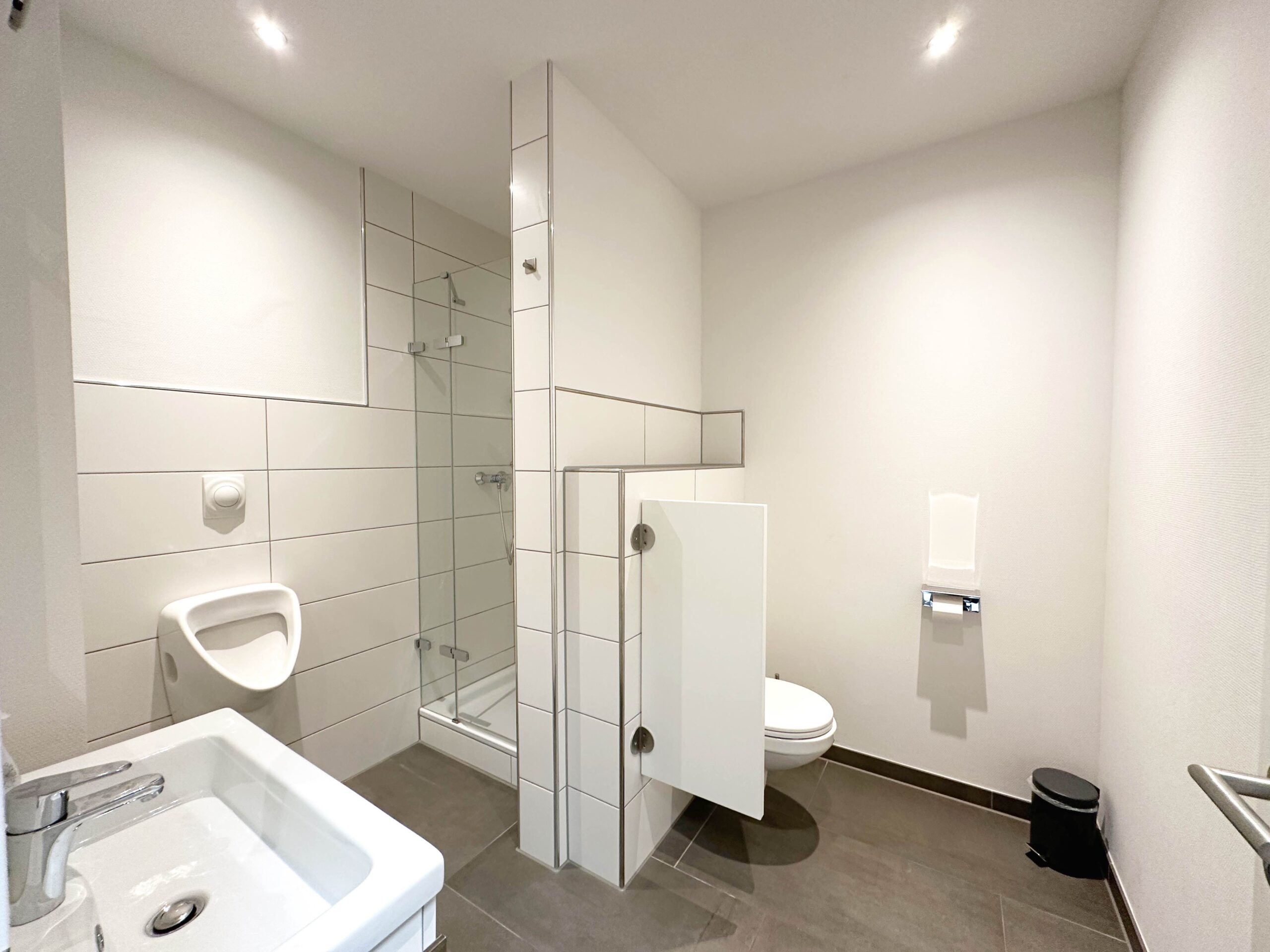 Im Jahr 1984 wurde das Gebäude rückwärtig erweitert. Durch diesen Anbau entstand im Erdgeschoss eine großzügige Gewerbefläche von rund 228 m². Die Fläche eignet sich ideal für Büro-, Dienstleistungs- oder Agenturnutzungen und ist aktuell solide vermietet. Die Flächen präsentieren sich modern, offen und hochwertig – mit großzügigen Arbeitsbereichen sowie ergänzenden, abgetrennten Büroräumen. Für dieses Mietverhältnis besteht auch in den kommenden Jahren Planungssicherheit, sodass hier stabile Mieteinnahmen gegeben sind.