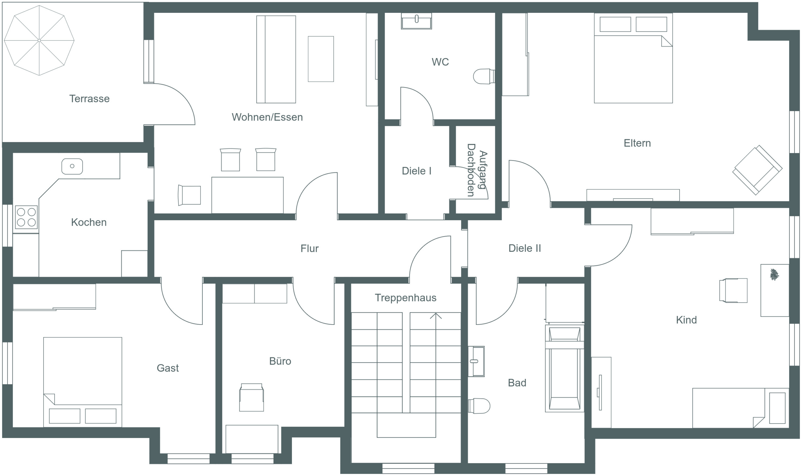 Wie den Grundrissen zu entnehmen ist, bietet diese Ebene bereits heute eine durchdachte Raumstruktur mit separaten Bereichen sowie einem großzügigen, ideal geschnittenen Wohnraum. Wasseranschlüsse sind auf dieser Etage bereits vorhanden, sodass sich in Abstimmung mit den entsprechenden Fachbetrieben mit vergleichsweise überschaubarem Aufwand eine hochwertige und sehr großzügige Wohnung schaffen ließe. In zentraler Lage von Kastellaun entstünde hier ein Wohnkonzept mit echtem Seltenheitswert und einer Wohnfläche von ca. 110 m² – ideal für Eigennutzer oder zur attraktiven Vermietung.
