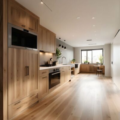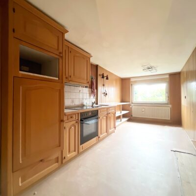 Die Küche liegt im hinteren Teil links und ist mit einer Einbauküche ausgestattet. Die Elektrogeräte stammen etwa aus dem Jahr 2020. Aktuell ist die Küche vom Wohnzimmer getrennt. Bei entsprechender statischer Prüfung könnte ein Wanddurchbruch denkbar sein, um einen offenen Wohn-, Ess- und Kochbereich zu realisieren