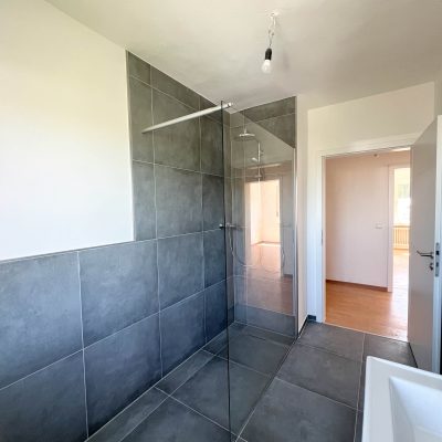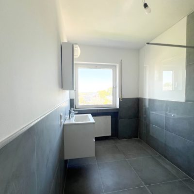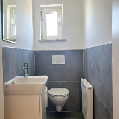 Das Badezimmer und das Gäste-WC wurden vollständig modernisiert und verfügen über eine stilvolle, grau geflieste Gestaltung mit einer begehbaren, barrierefreien Dusche.
