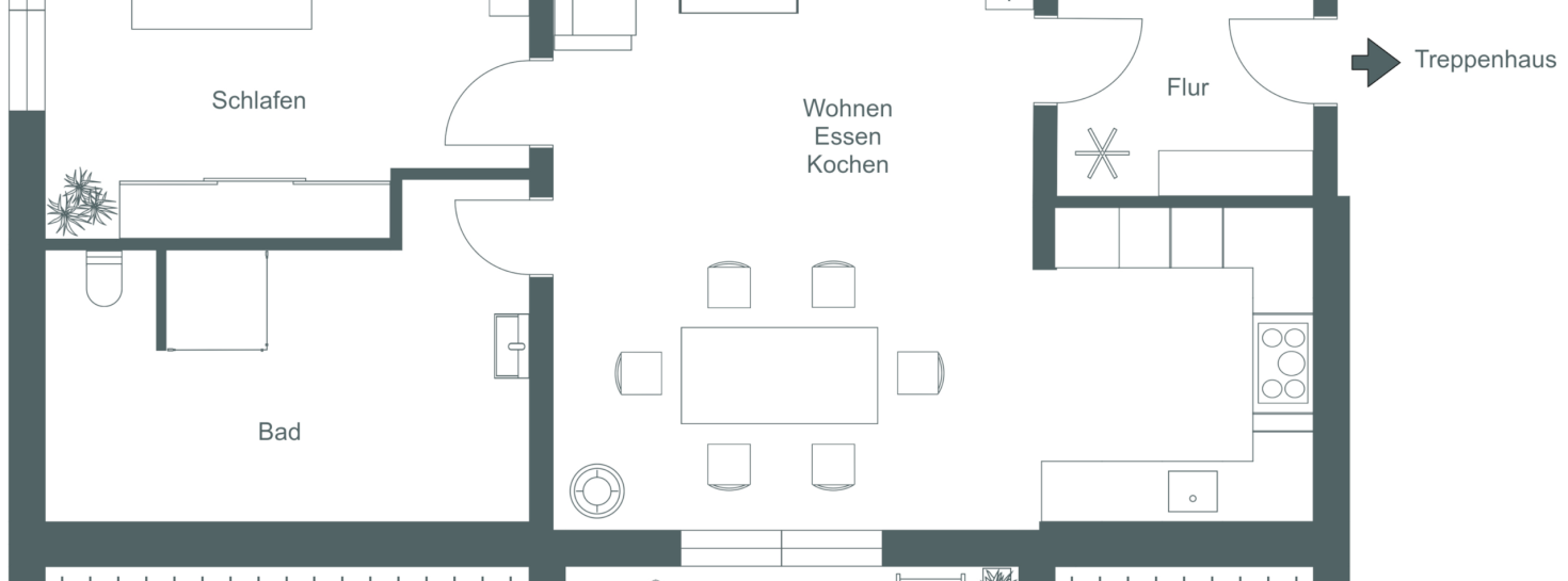 Der Wohnbereich bietet ausreichend Platz für einen Esstisch, eine Couchlandschaft sowie ergänzende Möbel wie Sideboard oder TV-Möbel.