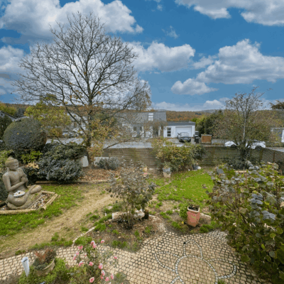 Der Garten ist durch die Hanglage fließend in mehrere Ebenen gegliedert und bietet sowohl sonnige Plätze als auch geschützte Rückzugsbereiche. Ein Zaun mit Tor trennt die dem jeweiligen Geschoss zugehörigen Außenbereiche sodass diese separat oder auch gemeinsam genutzt werden können.