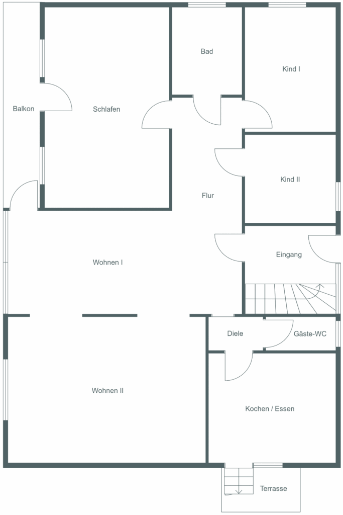 Das Untergeschoss ist sowohl über die innenliegende Treppe im Eingangsbereich des Erdgeschosses als auch über eine eigens dafür vorgesehene Tür von außen zugänglich.