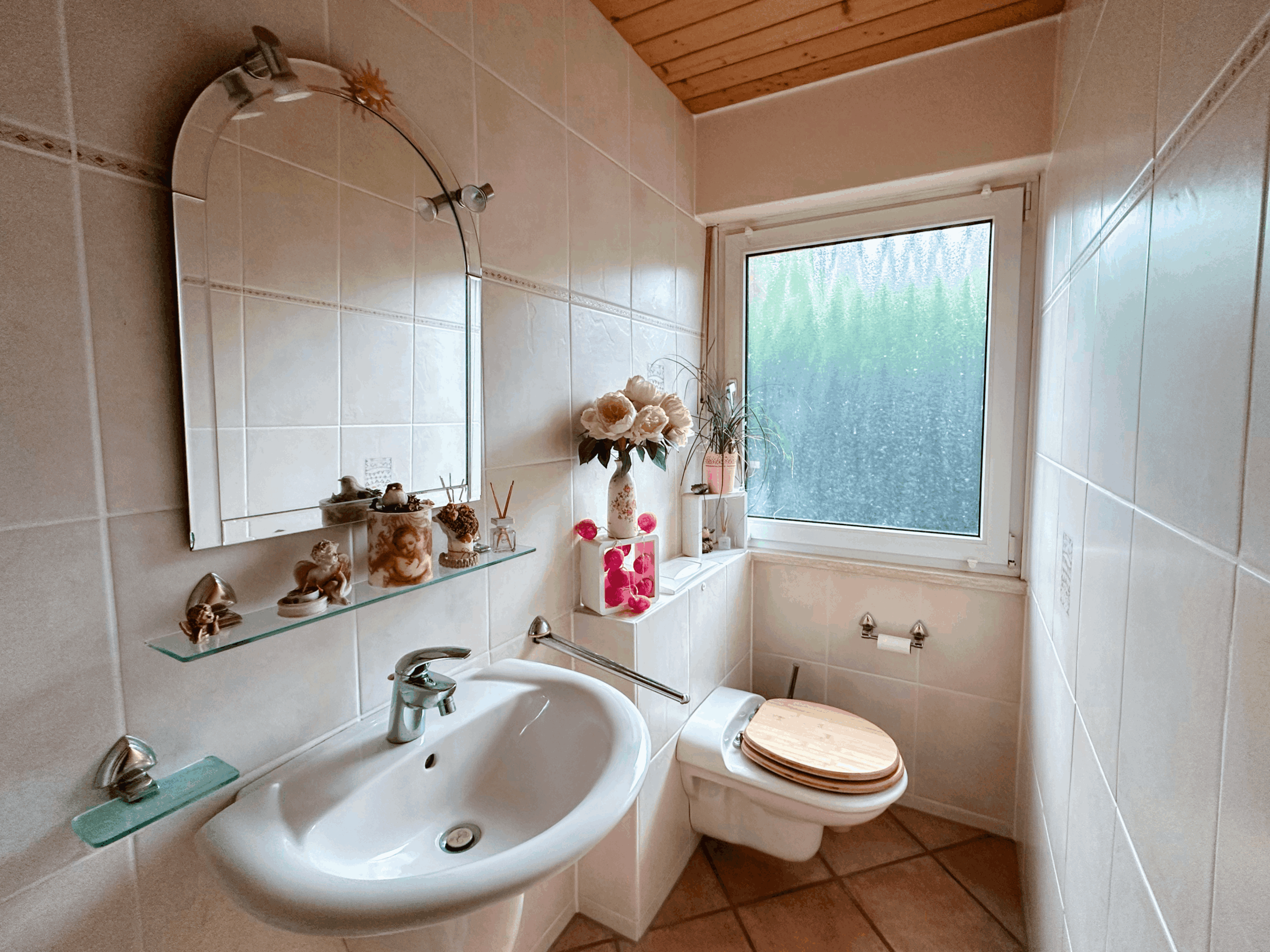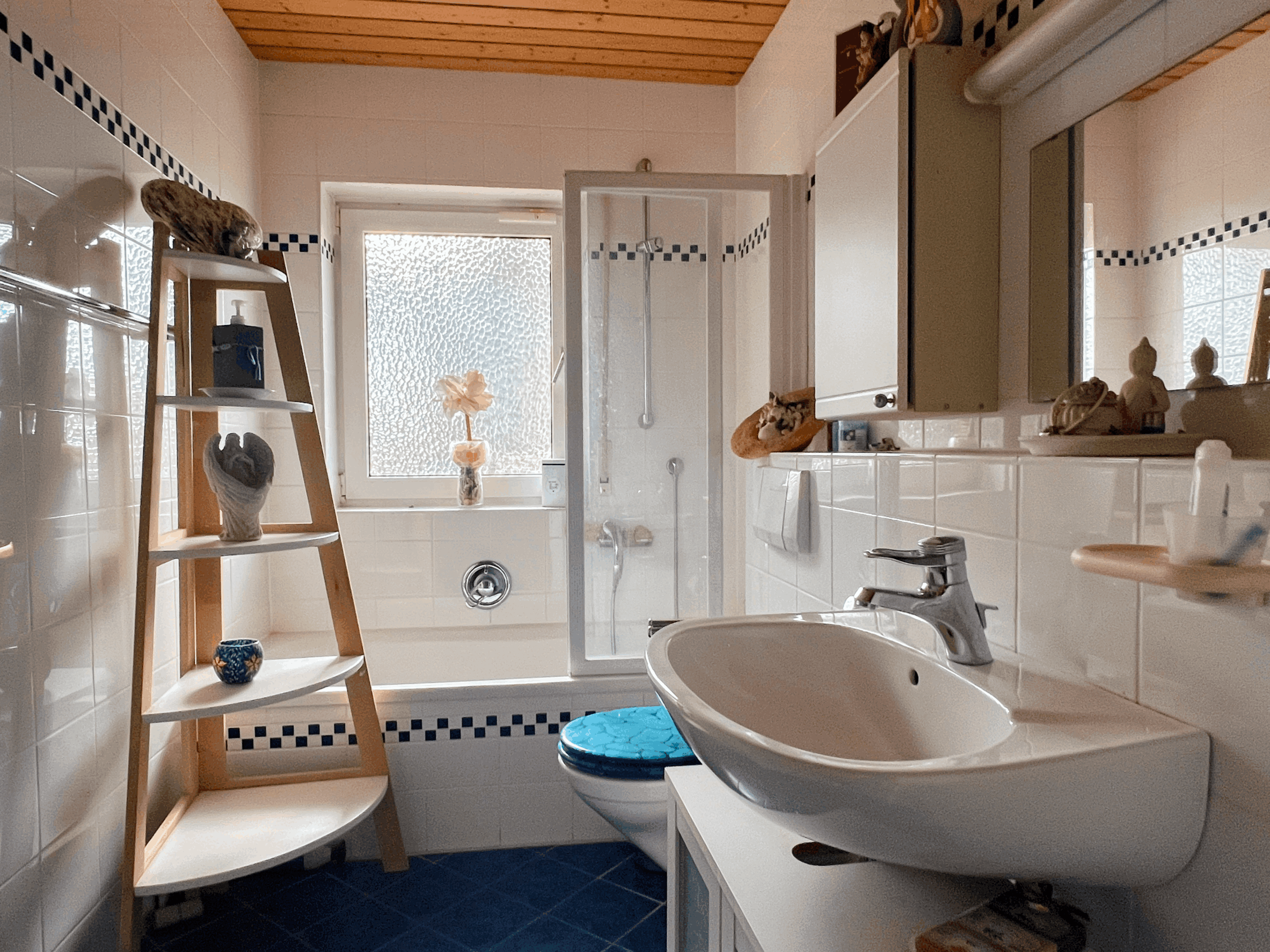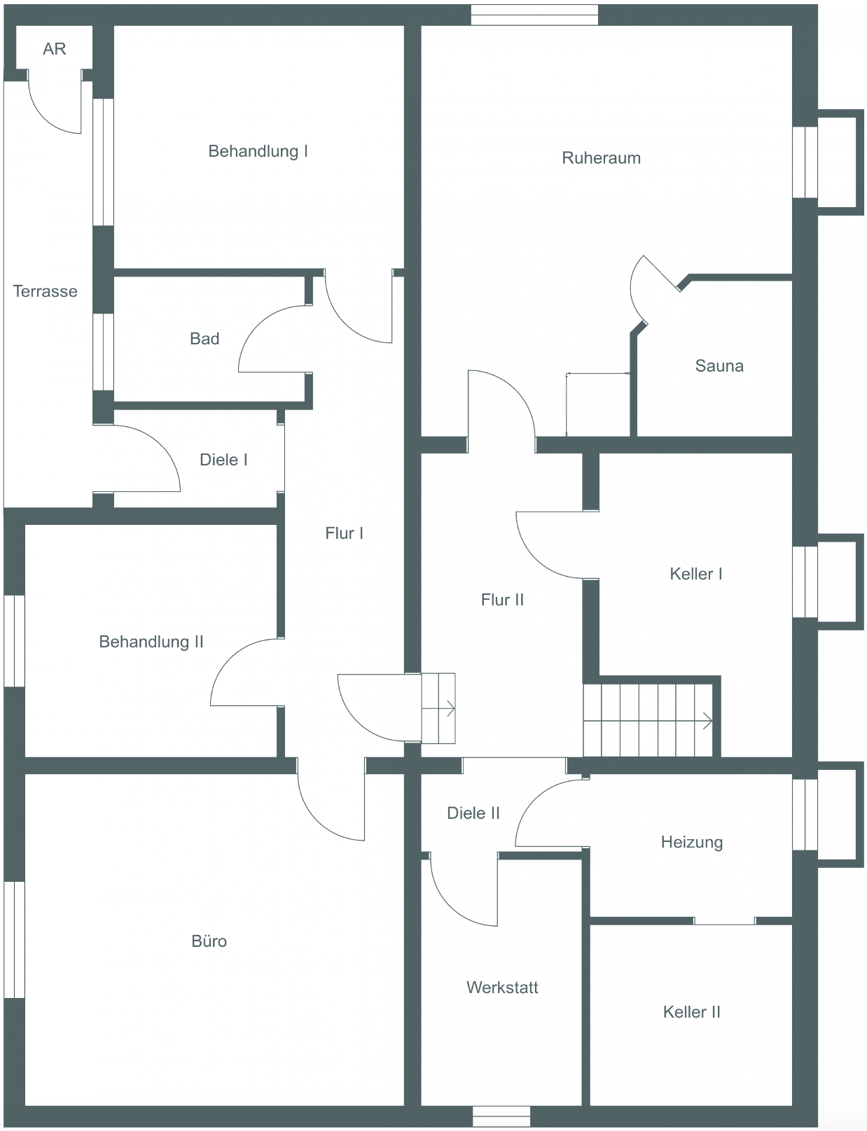 Der Wohnbereich im Untergeschoss wird durch eine abschließbare Verbindungstür vom Kellerbereich getrennt und beherbergt ein Tageslichtbad sowie drei weitere Räume, die sich, je nach Bedarf, als Wohnzimmer, Schlafzimmer, Küche oder auch als Hobbyraum nutzen lassen. Ihrer Kreativität sind hier keine Grenzen gesetzt. Aktuell werden diese Räumlichkeiten, wie aus den Grundrissen ersichtlich, als Praxisräume genutzt.