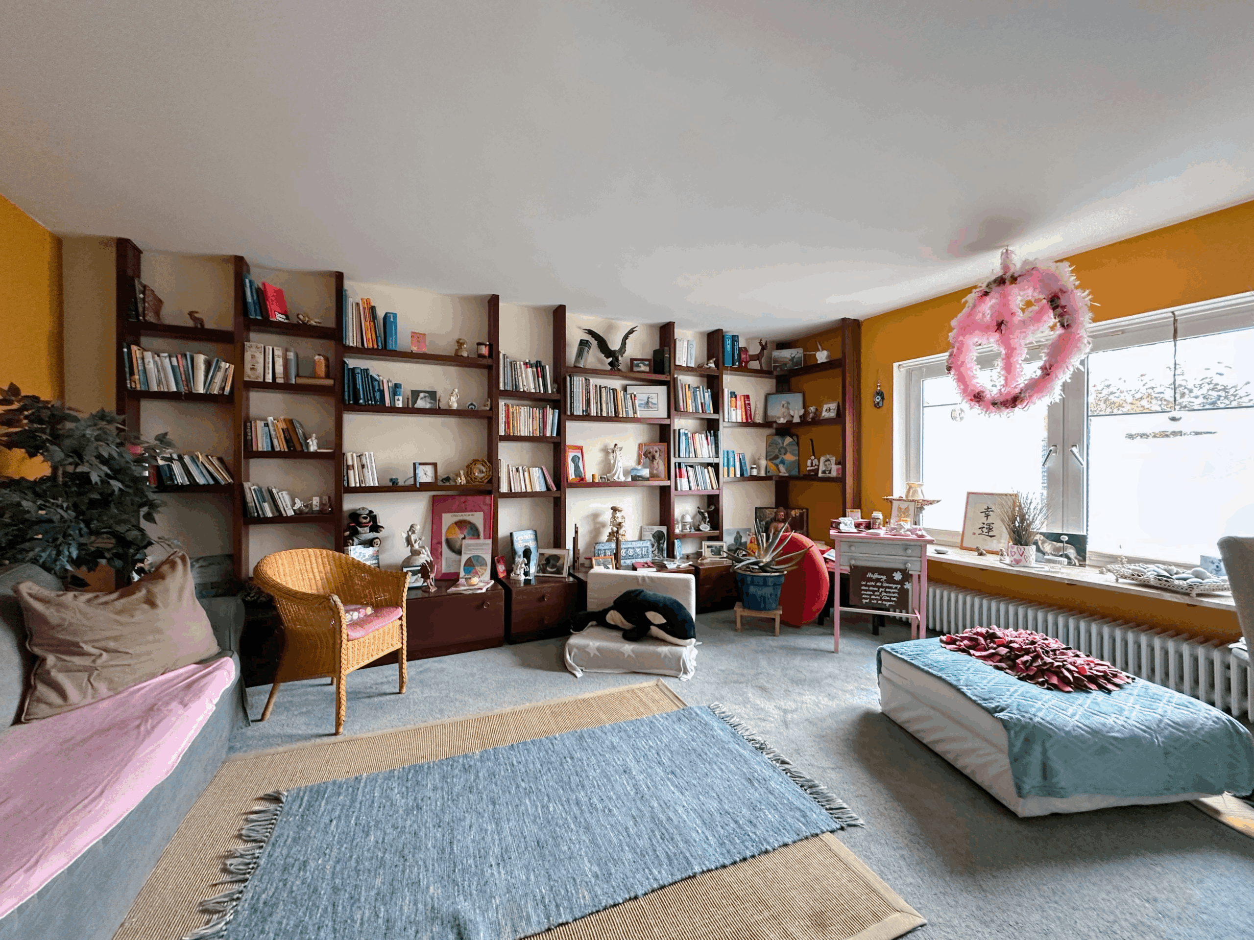Vom zentralen Wohnbereich erschließt sich rechterhand der private Trakt mit einem Schlafzimmer, zwei weiteren Zimmern und dem Badezimmer. Linkerhand führt eine Diele zum Gäste-WC und zur Küche.