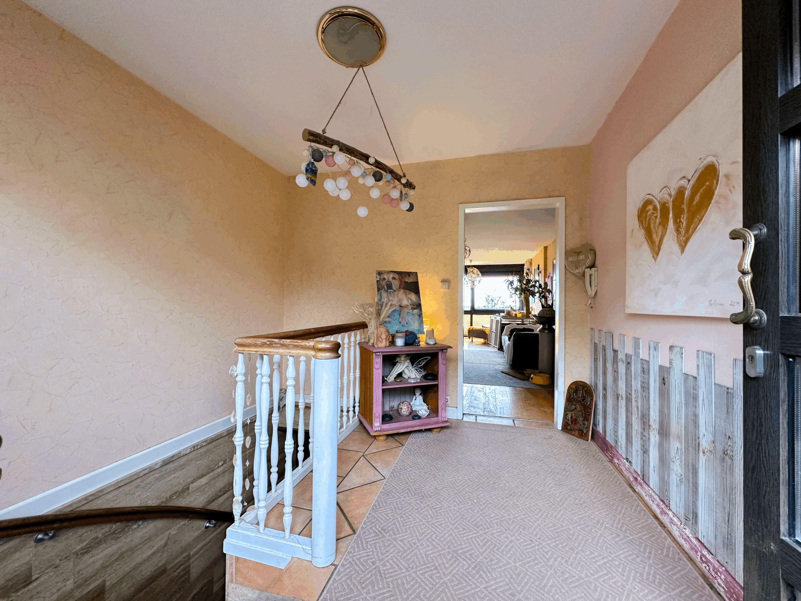 Bereits beim Betreten des Hauses empfängt Sie ein heller, freundlicher Eingangsbereich. Von hier aus führt der Weg weiter in den offen gestalteten Wohnbereich, der durch große Fensterflächen einen atemberaubenden Panoramablick direkt über das Tal eröffnet, der Licht und Weite in das Herz des Hauses bringt.
