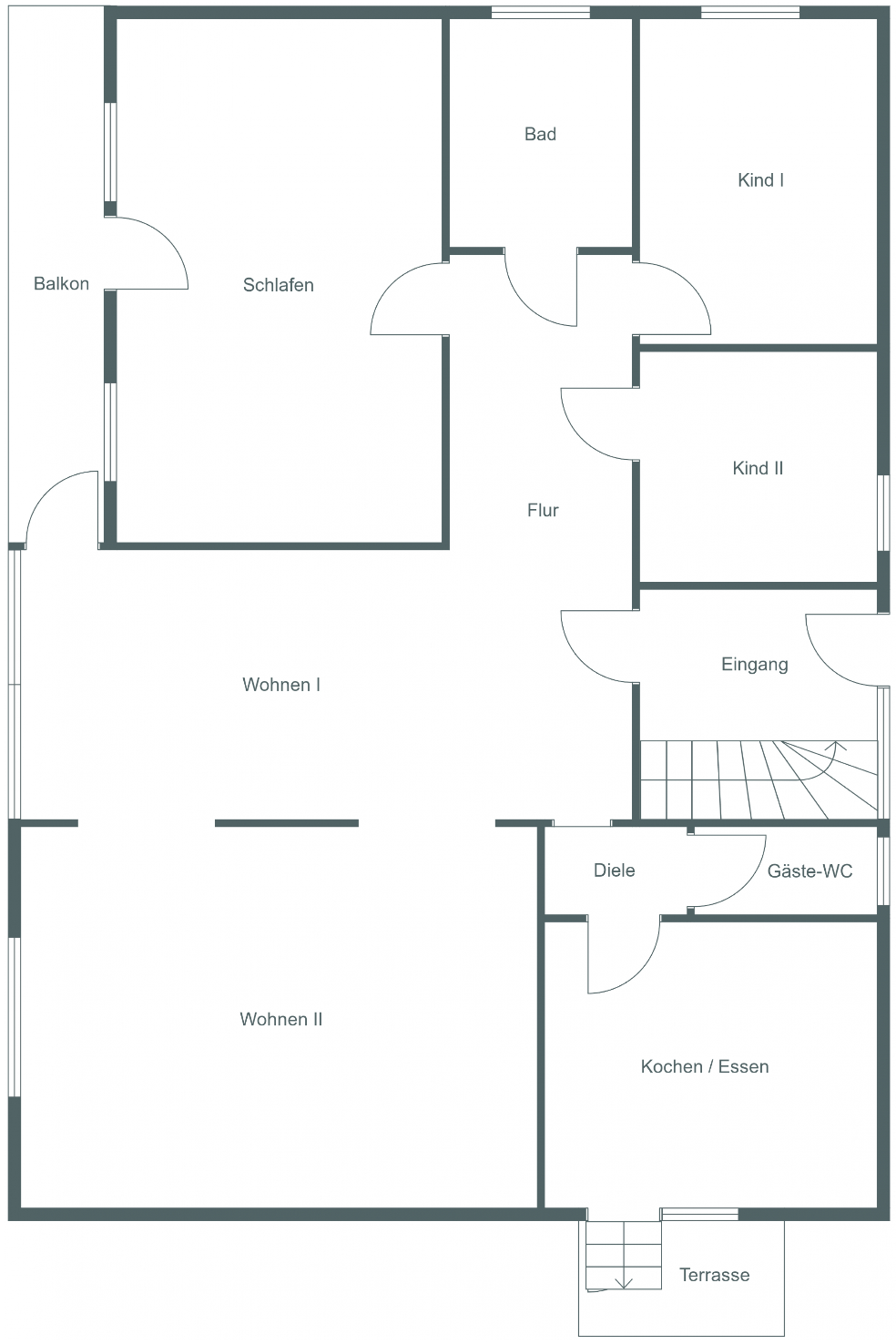 Das Untergeschoss ist sowohl über die innenliegende Treppe im Eingangsbereich des Erdgeschosses als auch über eine eigens dafür vorgesehene Tür von außen zugänglich.