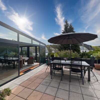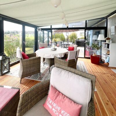 Während Sie vom Wohnbereich einen direkten Zutritt in den mit Klimaanlage ausgestatteten Wintergarten haben, der Ihnen das ganze Jahr die Natur ins Haus bringt, gelangen Sie vom Essbereich aus direkt auf die Terrasse und den im Anschluss liegenden Garten. Wintergarten und Terrasse sind wiederrum miteinander verbunden.
