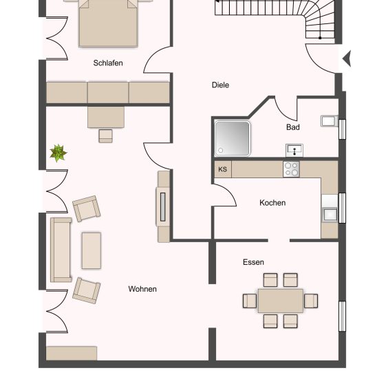 Abgerundet wird die Erdgeschosswohnung durch einen weiteren Raum, den wir in unserem Grundriss als Schlafzimmer vorgesehen haben und ein Tageslicht-Duschbad.